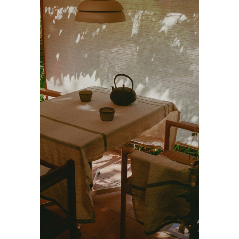 Kvalitný veľký obrus Usva zo 100% ľanu v minimalistickej kombinácii podkladu v prírodnom odtieni ľanu a olivovo zelených pruhov po stranách.