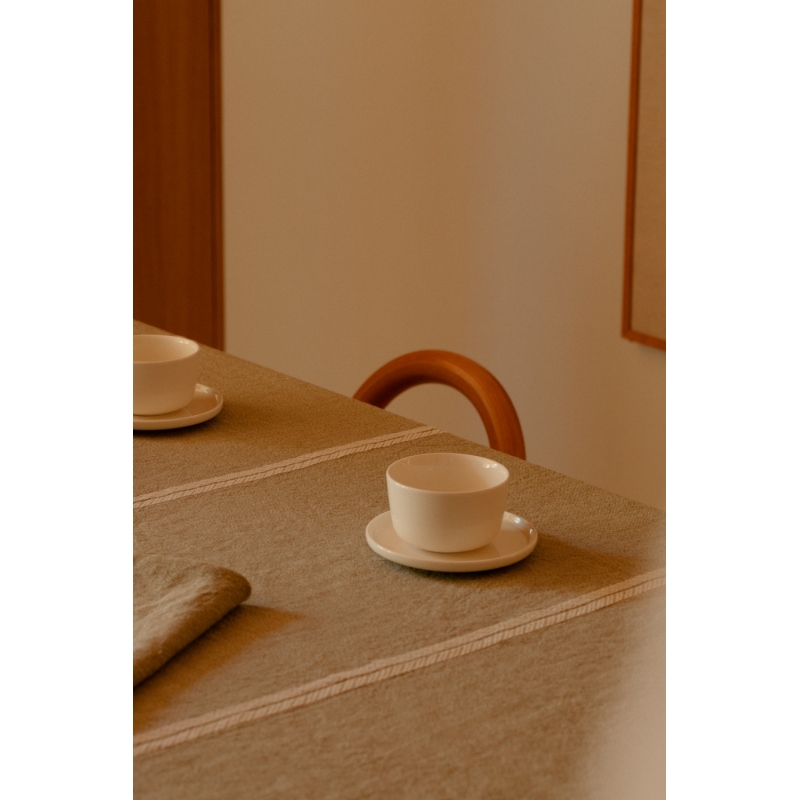 Obrus Venla je tkaný zo 100% ľanu a využíva tzv. melírované priadze – teda kombináciu dvoch farieb, ktorá vytvára jemný, živý farebný dojem. Výrazným detailom je ozdobný pruh z hrubšej priadze, ktorý dodáva látke hĺbku a ručne tkaný charakter.
