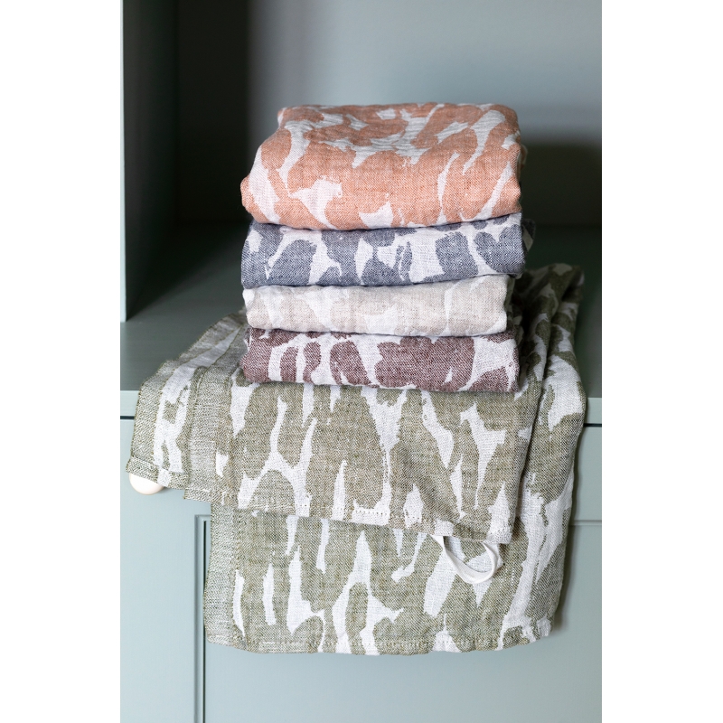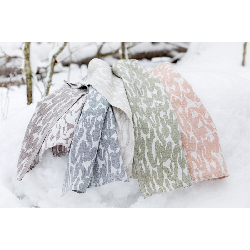 Uterák je tkaný zo 100% ľanu so severským vzorom Jäkälä (lišajník), který je inšpirovaný lesom, po ktorom sa rozprestierajú lišajníky. Ľan rýchlo schne a je príjemný na telo. Veľkú osušku môžete použiť nielen v kúpeľni na osušenie, ale aj ako jednoduchý kilt omotaním okolo pása v saune a tiež výborne poslúži aj ako plážová osuška k moru.