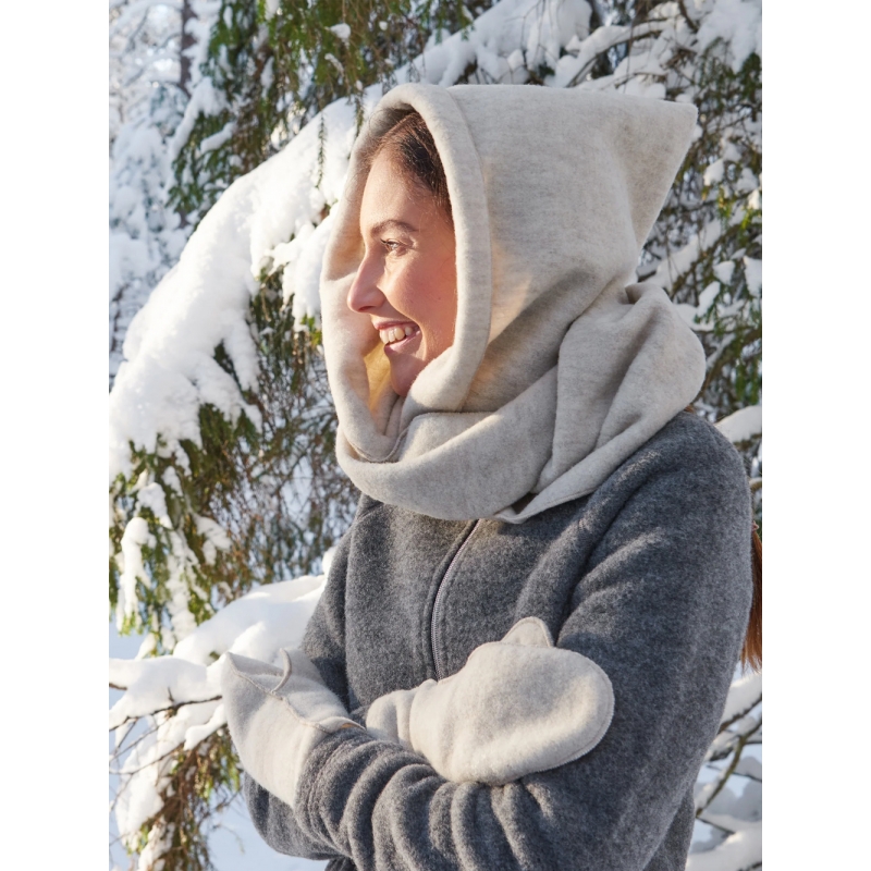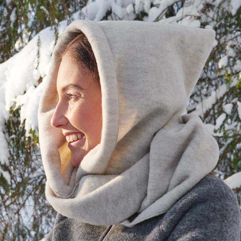 Zabaľte sa do najteplejšej zimnej kombinácie! Hebký fleece z organickej merino vlny múdro spája šál a kapucňu v jednom – elegantné, praktické a neuveriteľne hrejivé riešenie. Kapucňa je priestranná, takže pohodlne pojme cop alebo drdol, a zároveň chráni pred chladom bez zničenia účesu. Skrátka tento šál si zamilujete!
