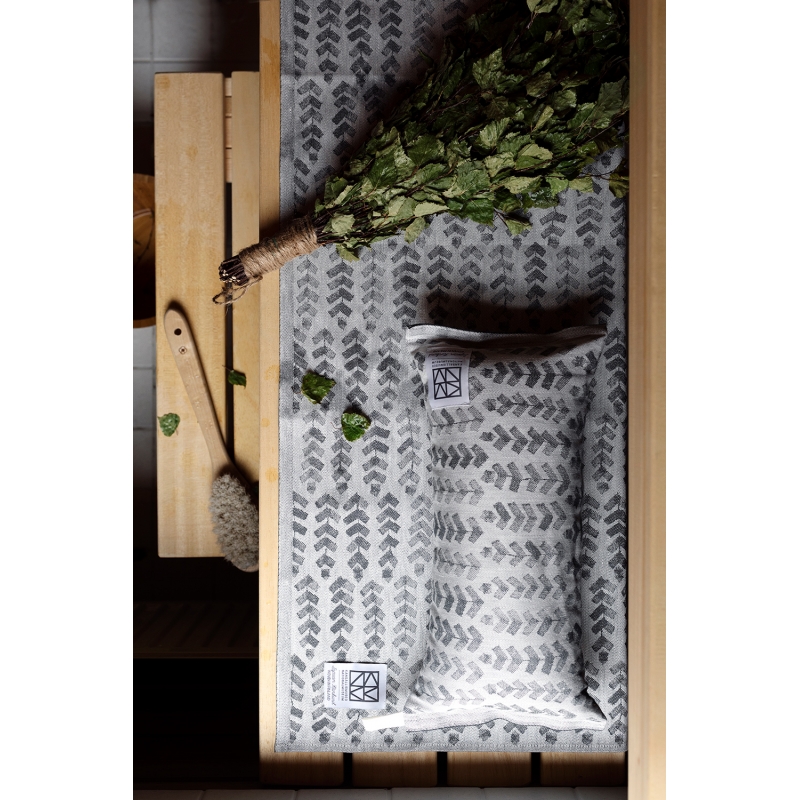 Krátka podložka na lavicu do sauny Ruusu v sivom odtieni aspen green a pre Lapuan Kankurit ju navrhla fínska dizajnérka Reet Ek. Kolekcia Ruusu vznikla v spolupráci s fínskym národným múzeom a je inšpirovaná štylizovaným motívom ruže, ktorý symbolizuje fínsky národný romantizmus.