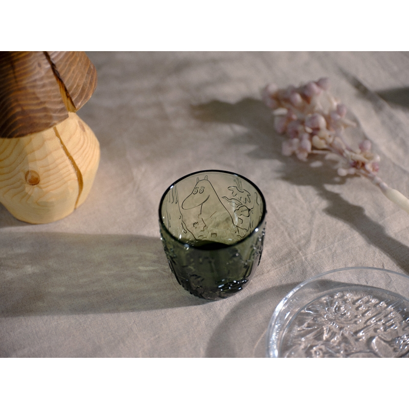Súprava dvoch zelených pohárov s motívom Muminka a Hattifatteners na motívy príbehov z kúzelného údolia od slávnej fínskej autorky Tove Jansson. Každý pohár je zdobený krásnymi textúrami, ktoré zachytávajú kúzlo mystického lesa, zatiaľ čo sa Muminek hrá na schovávačku. Sada obsahuje 2 poháre balené v štýlovom darčekovom balení.