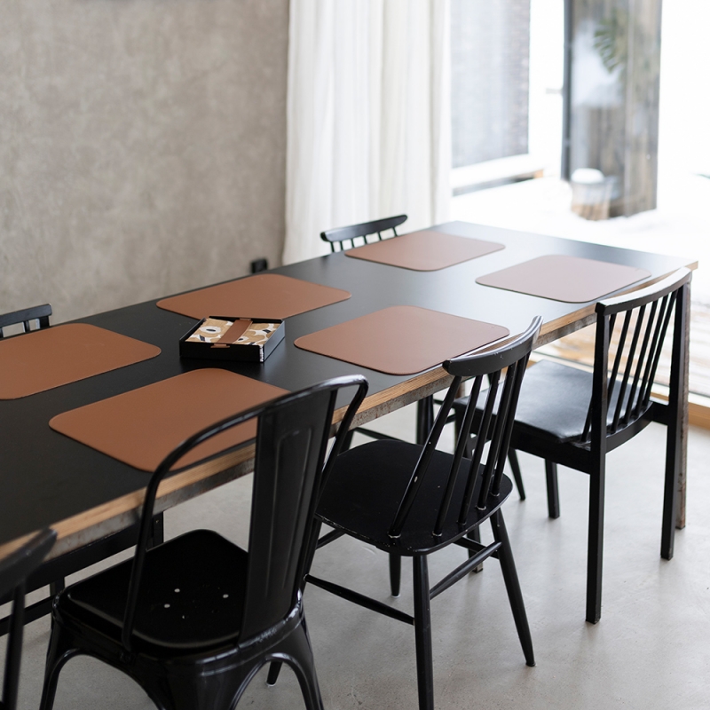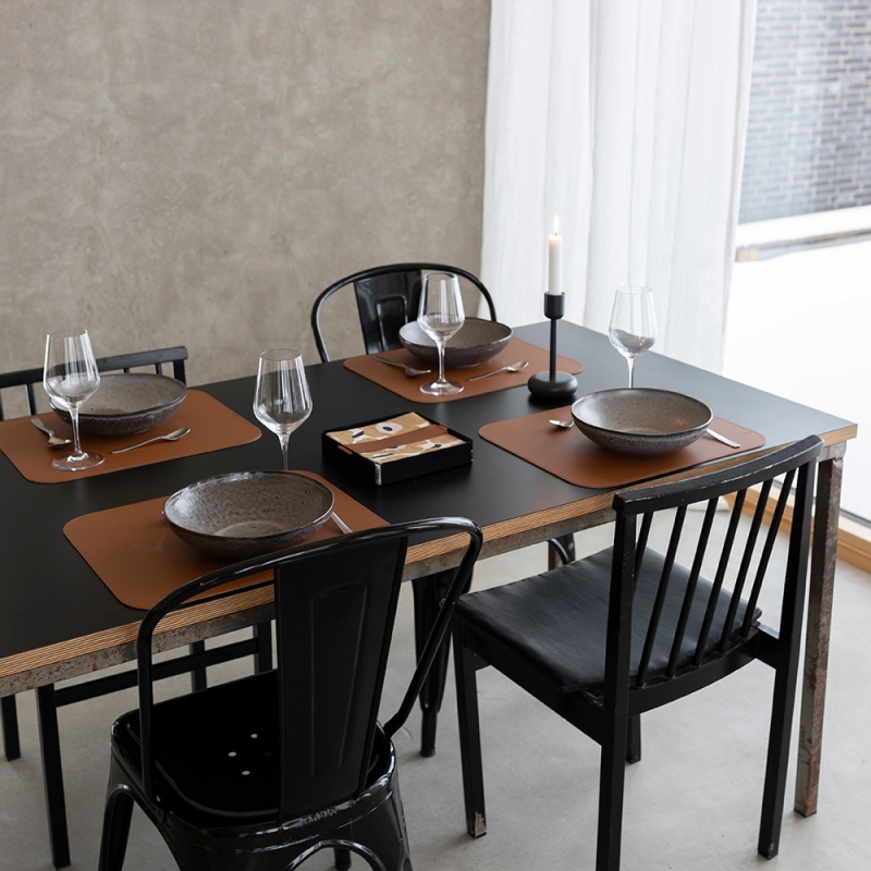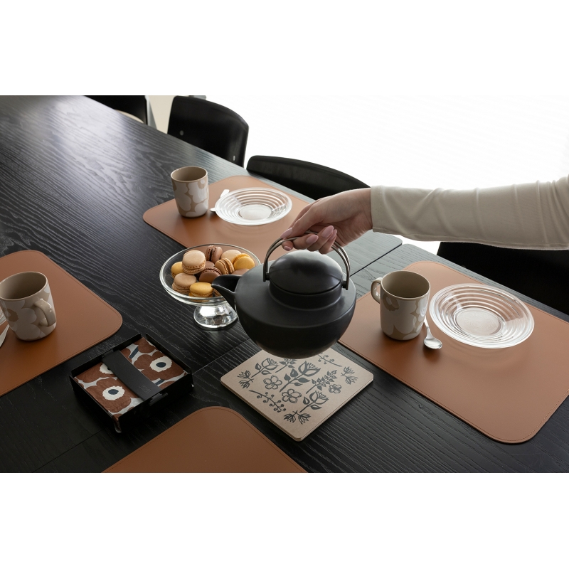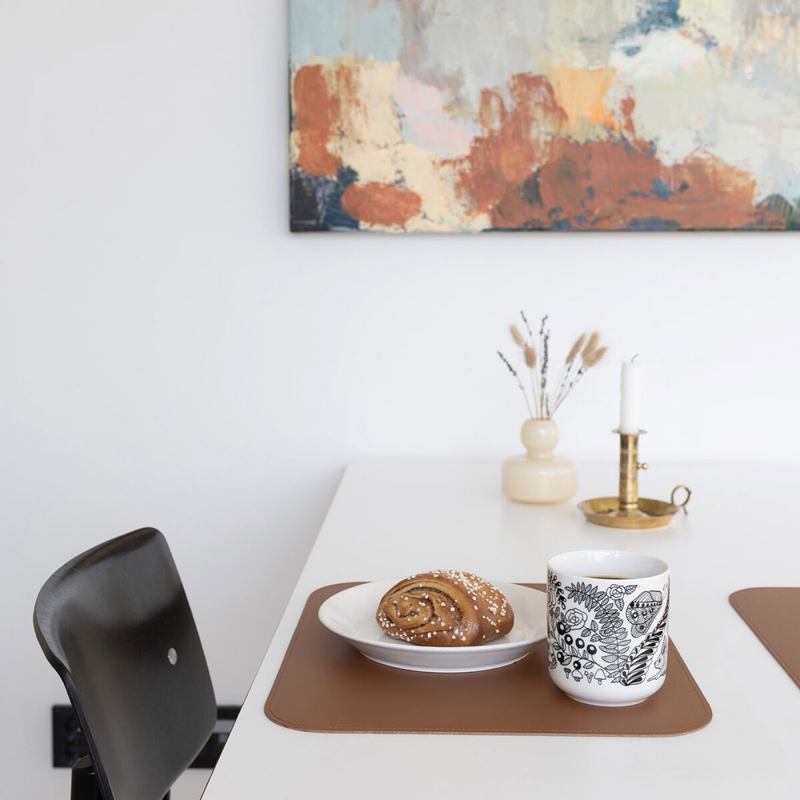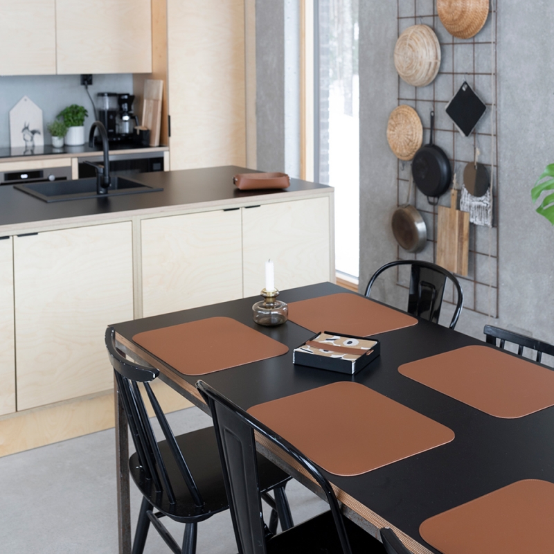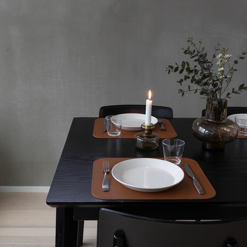 Kvalitné prestieranie z hnedej recyklovanej kože doladí jedálenský stôl a chráni ho pred škvrnami a prípadnými nárazmi riadu a pohárov. Prešívané okraje dotvárajú nadčasový štýl, ktorý ľahko zapadne do moderných aj tradičných interiérov. Prestieranie môžete použiť aj na pracovnom stole ako podložku pod notebook alebo písaciu súpravu. Prestieranie sa vyrába priamo vo Fínsku.