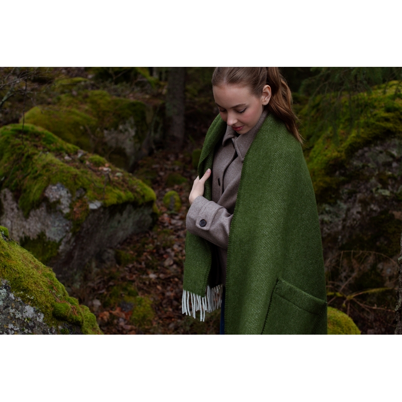 Vlnený šál Arvo je utkaný vo Fínsku z prvotriednej fínskej ovčej vlny Finnsheep v kombinácii s certifikovanou novozélandskou vlnou. Praktické vrecká navyše prinášajú možnosť si do nich uschovať potrebné drobnosti a tiež zahriať ruky. Olivovo zelený odtieň je elegantný a šál dovádzajú k dokonalosti strapce.