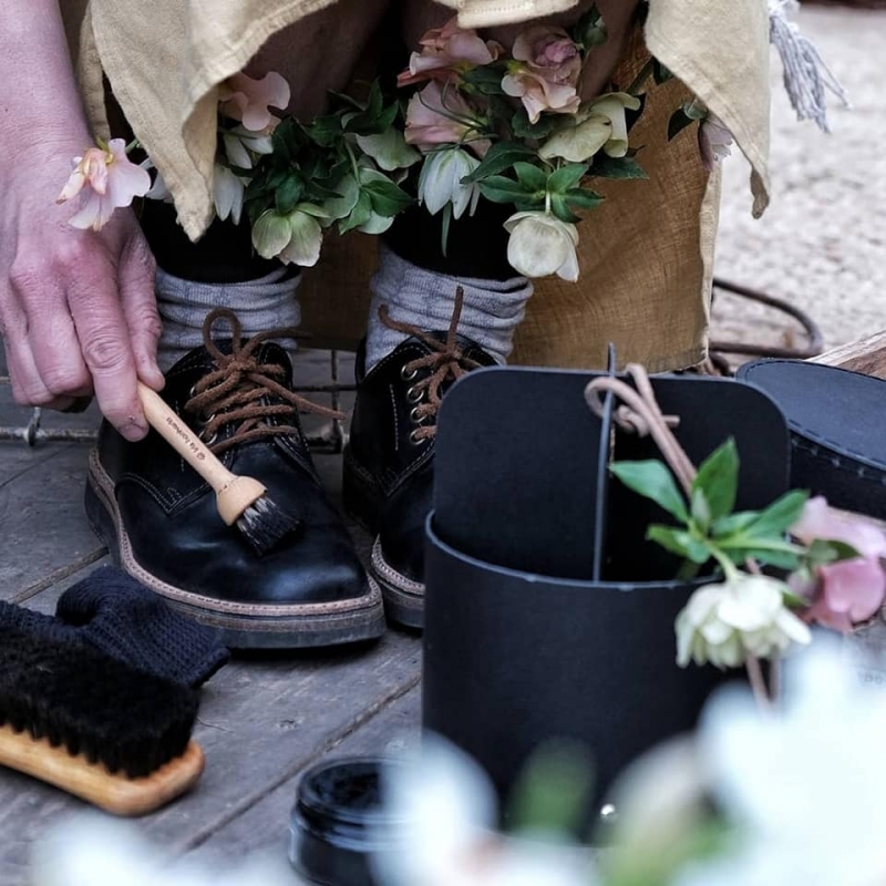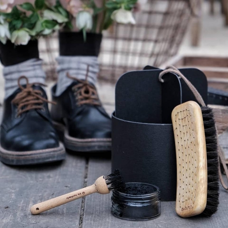 Kvalitný set, ktorý urobí z čistenia obuvi príjemný rituál. V elegantnej čiernej krabičke nájdete malú kefu na nanášanie laku, veľkú kefu na preleštenie, handričku a čierny lak. Rukoväte kief sú z masívneho bukového dreva, vlas je zo šetrne získaných konských vlasov a má výbornú pevnosť a elasticitu.