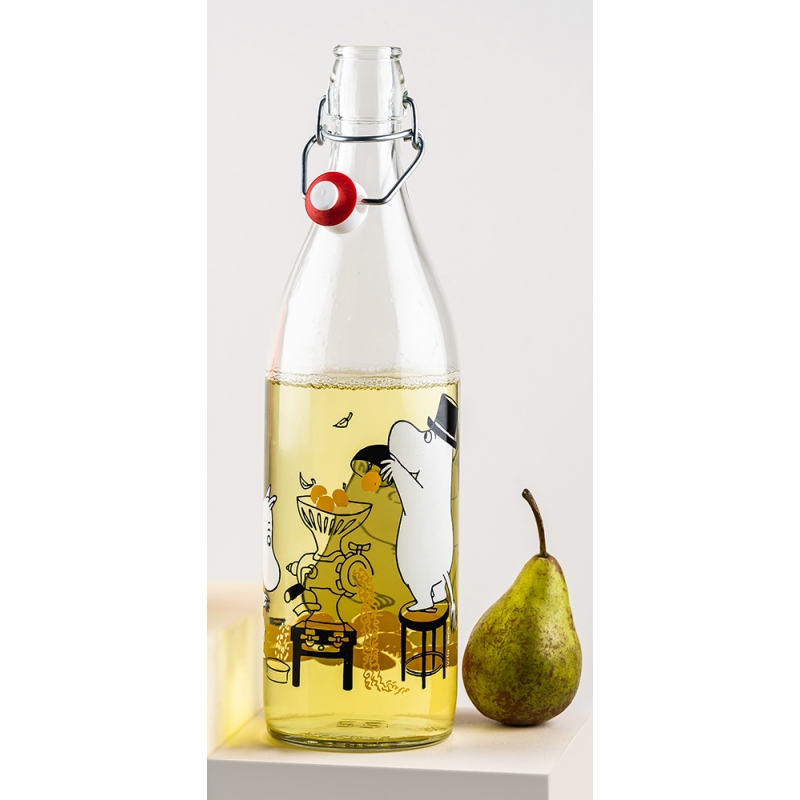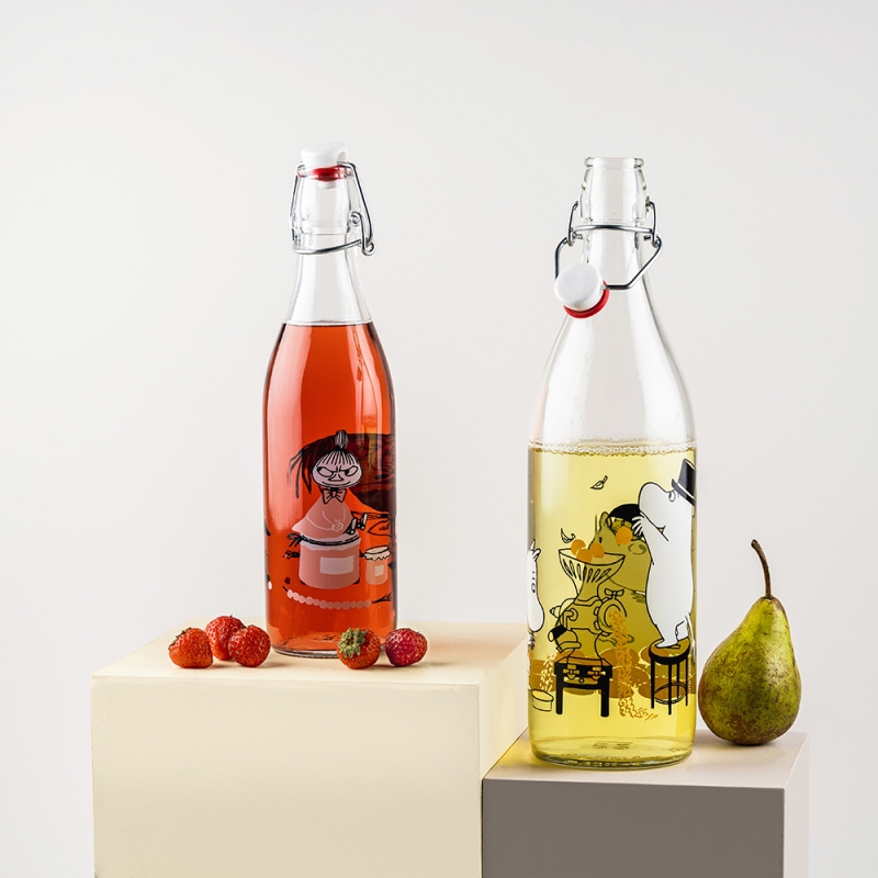Dizajnová sklenená fľaša s uzáverom zdobená milým motívom rozprávkových muminkovktorí spracovávajú letnú úrodu. Naplňte ju čistou vodou, domácim sirupom, limonádou alebo si do nej pripravte čerstvú šťavu. Hlavní hrdinovia príbehov z mumínkovského údolia vám budú robiť radosť každý deň.