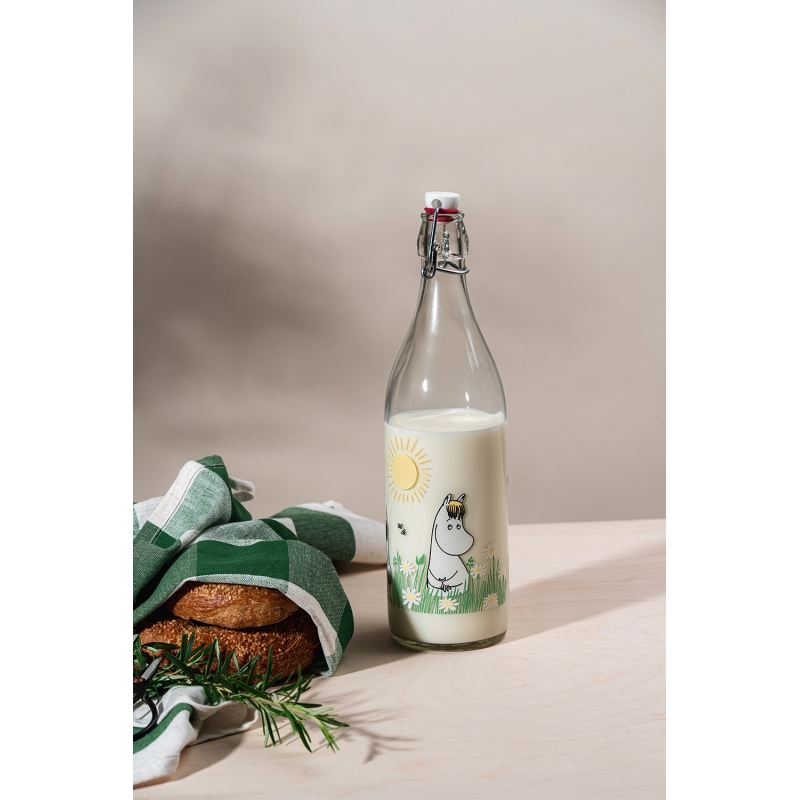 Dizajnová sklenená fľaša s uzáverom zdobená milým motívom rozprávkových Muminkov a kravičky na lúke. Naplňte ju mliekom, čistou vodou, domácim sirupom, limonádou alebo si do nej pripravte čerstvú šťavu. Hlavní hrdinovia príbehov z muminkovského údolia vám budú robiť radosť každý deň.