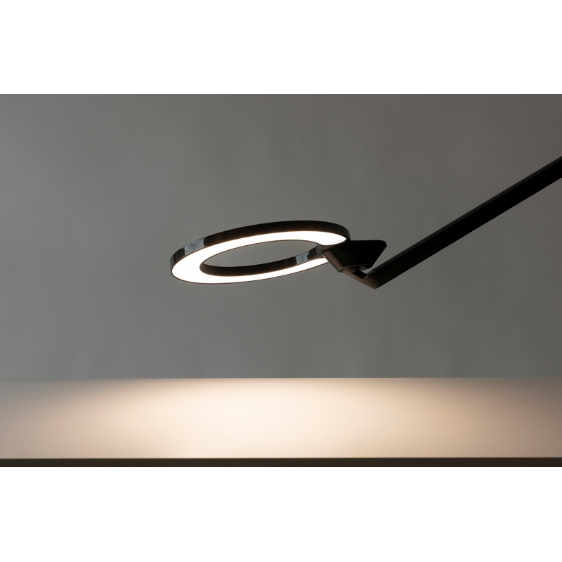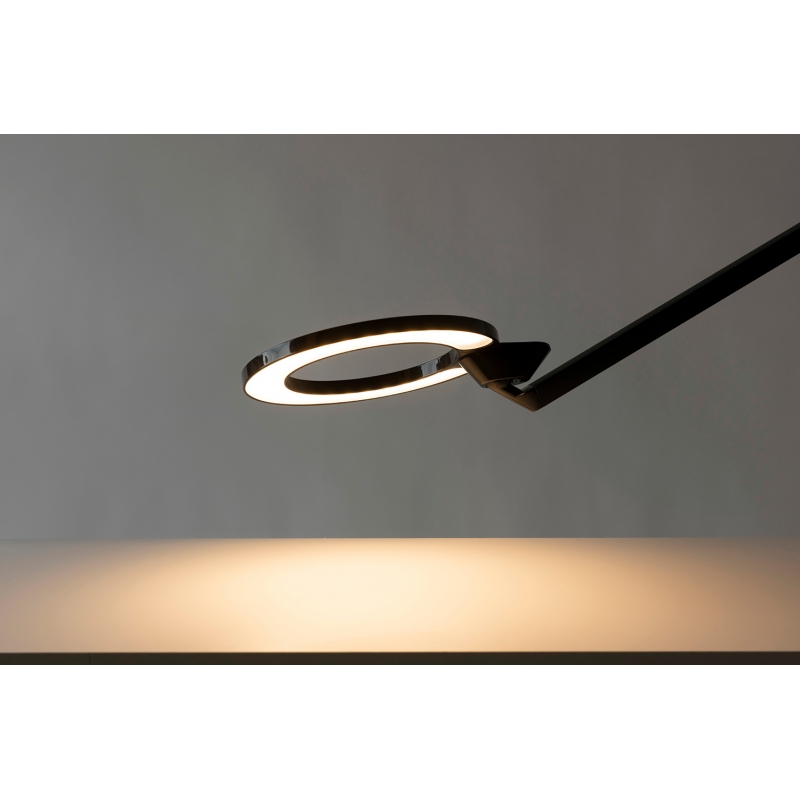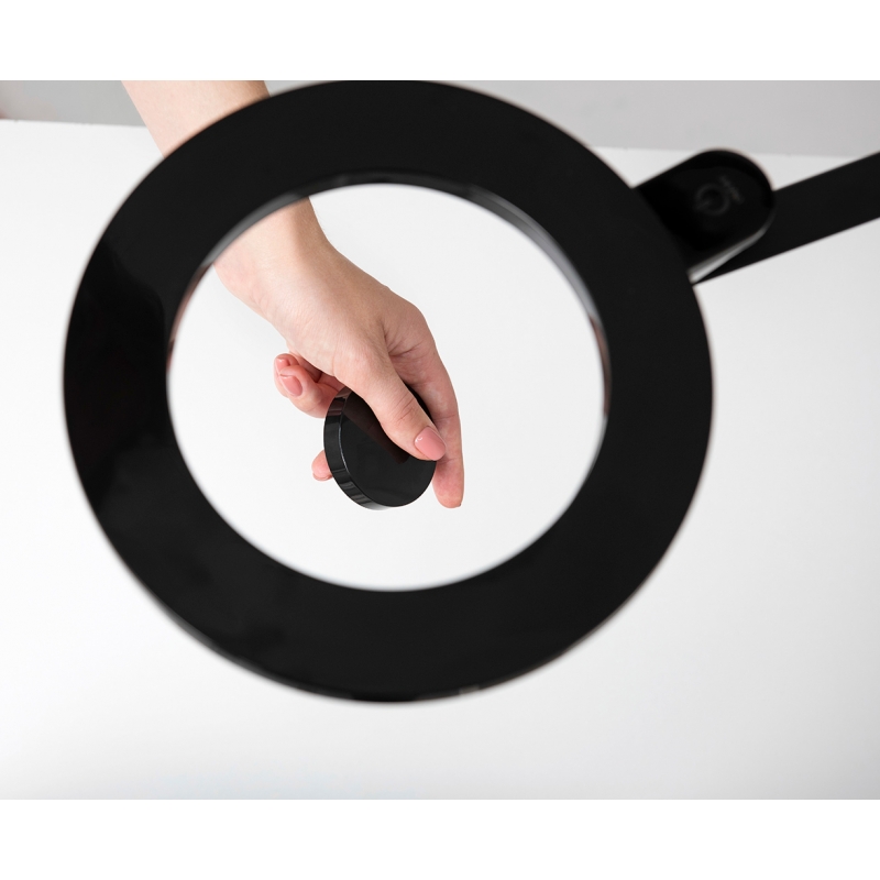 Čierna stolná lampa Sipoo s kruhovým LED svietidlom má ideálne proporcie pre pracovný stôl. Vďaka svojmu tvaru dodáva svetlo na väčšiu plochu, rám môžete variabilne nastaviť a posvietiť si na prácu z rôznych uhlov a vzdialenosti. A čo viac, tiež je možné nastaviť teplotu svetla a jeho intenzitu podľa potreby pomocou bezdrôtového ovládača, ktorý si môžete umiestniť napríklad hneď vedľa klávesnice alebo tam, kde bude najviac po ruke.