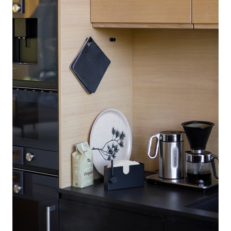 Elegantná kuchynská chňapka z losej kože a vlny má šikovne umiestnený ohyb na dlani a dobre tak padne do ruky. S chňapkou ľahko a bezpečne uchopíte horúce hrnce, panvice a pekáče a môžete ju použiť aj ako podložku pod hrniec pri servírovaní. Koža pochádza z voľne žijúcich losov a je vedľajším produktom primeranej regulácie losej populácie. Chňapka má praktické oko na zavesenie.