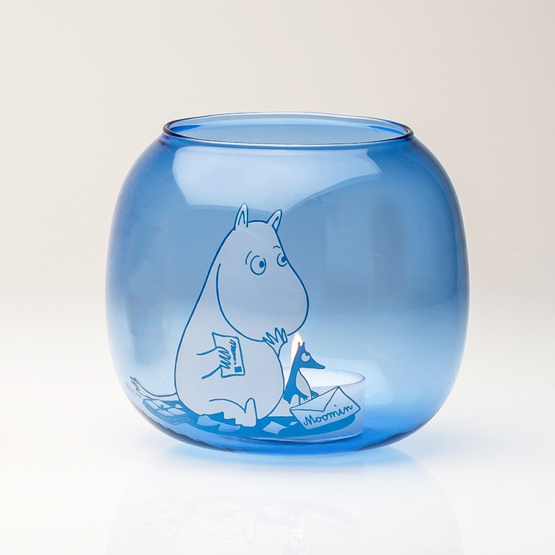 Modrý sklenený svietnik zdobený motívom Muminka od slávnej fínskej autorky Tove Jansson. Svietnik je balený v darčekovej krabičke.