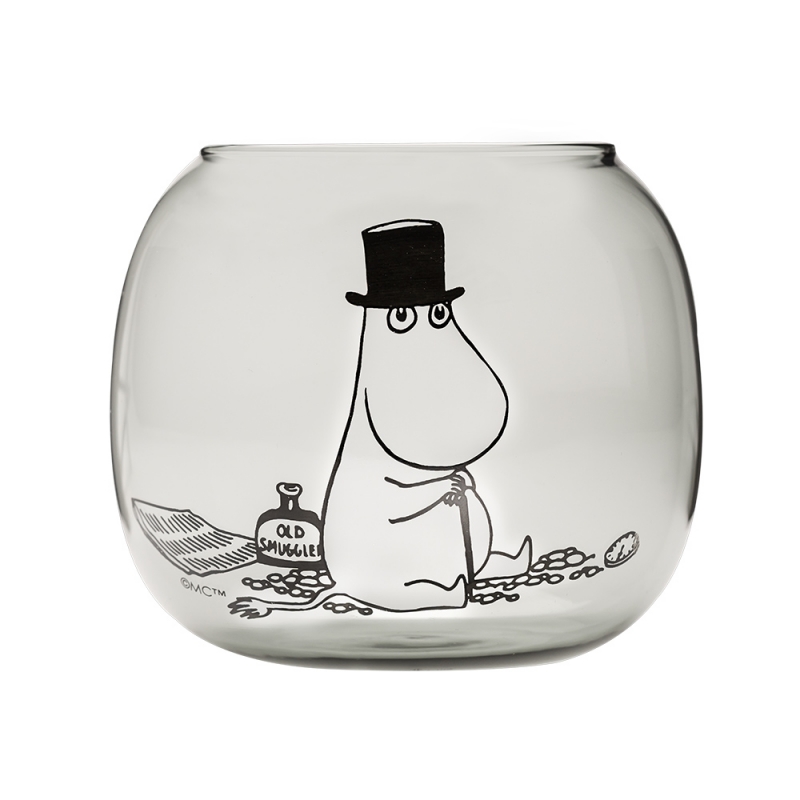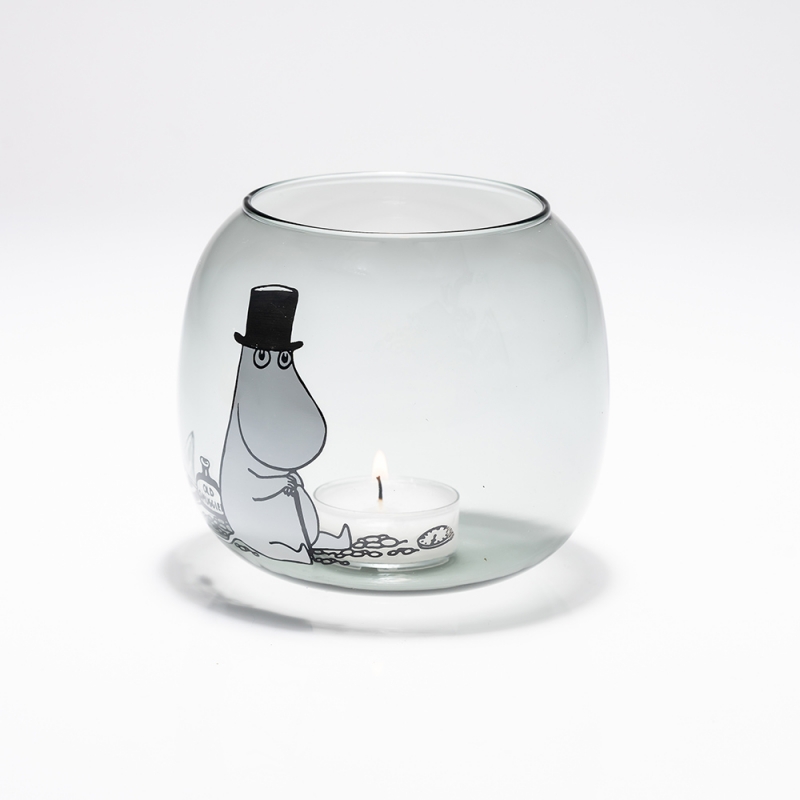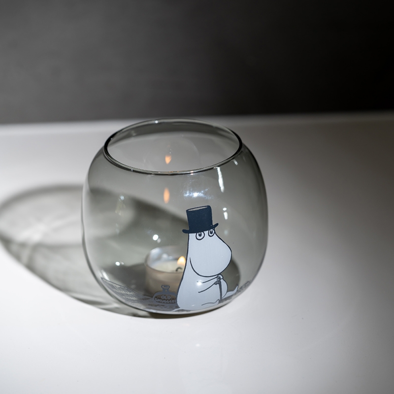 Sivý sklenený svietnik zdobený motívom otecka Muminka od slávnej fínskej autorky Tove Jansson. Svietnik je balený v darčekovej krabičke.