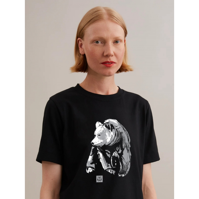 Kvalitné tričko s motívom medveďa od fínskeho maliara Teemu Järviho. Tričko je zodpovedne ušité v Estónsku z unikátneho recyklovaného materiálu. Látka je odolná, príjemná a drží tvar. Pri jej výrobe sa nepoužívajú žiadne farbivá, chemikálie a výroba vytvára o 50% menej emisií oxidu uhličitého a spotrebuje o 99,9% menej vody. Potlač je potom nanesená vo Fínsku.