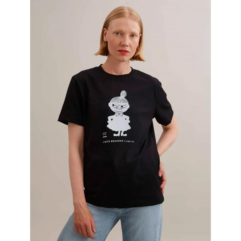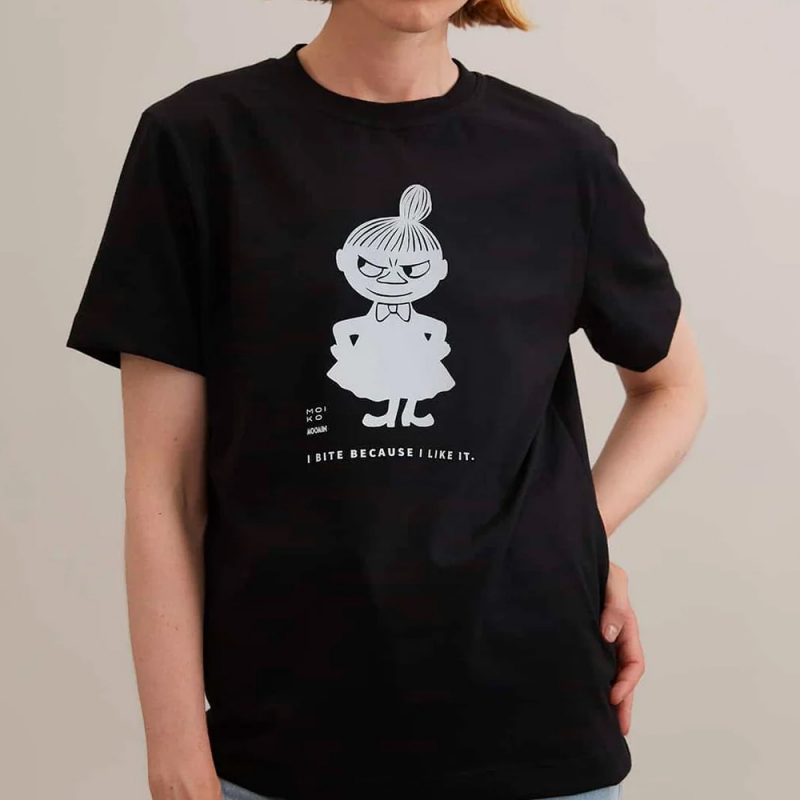 Kvalitné tričko s motívom Little My z rozprávkových Muminkov od slávnej fínskej autorky Tove Jansson nesie motto malej nezbednice: "I bite because I like it." Tričko je zodpovedne ušité v Estónsku z unikátneho recyklovaného materiálu. Látka je odolná, príjemná a drží tvar. Pri jej výrobe sa nepoužívajú žiadne farbivá, chemikálie a výroba vytvára o 50% menej emisií oxidu uhličitého a spotrebuje o 99,9% menej vody. Strieborno sivá potlač je potom nanesená vo Fínsku.