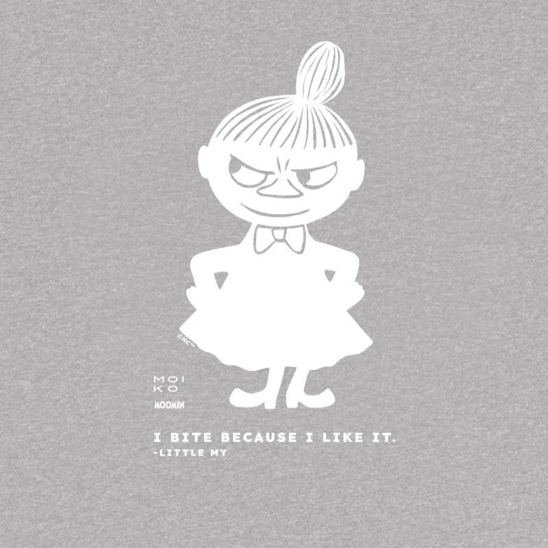 Kvalitné tričko v sivom odtieni s motívom Malej Mii z rozprávkových Mumičiek od slávnej fínskej autorky Tove Jansson nesie motto malej nezbednice: "I bite because I like it."