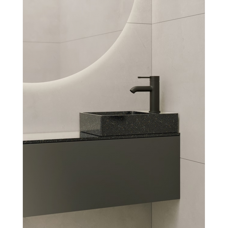 Obdĺžnikové umývadlo Cube40 Slim z prírodného kompozitu masívneho osikového dreva a živice dodá vašej kúpeľni príjemnú a pokojnú atmosféru. Je navrhnuté tak, aby sa dokonale zmestilo do malých priestorov, takže je ideálnym riešením pre samostatnú toaletu alebo kompaktnú domácu kúpeľňu. Pod umývadlo možno ľahko umiestniť malú poličku alebo skrinku. Napriek kompaktným rozmerom je umývadlo dostatočne široké na pohodlné umývanie rúk. Sofistikovaný a zároveň jednoduchý nadčasový dizajn necháva vyniknúť jedinečnej konštrukcii. Inovatívny materiál priamo od spoločnosti Woodio je nepriepustný, ľahko sa udržiava, je 100 % recyklovateľný a jeho výroba zanecháva o 80 % nižšiu uhlíkovú stopu ako bežné keramické umývadlá. Kvalitu garantuje výrobca predĺženou zárukou 5 rokov. Táto verzia má otvor pre batériu umiestnený na pravej strane.
