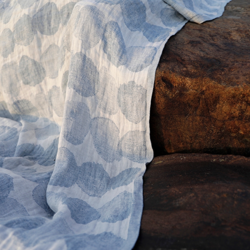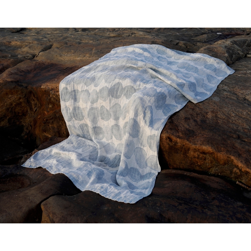 Uterák Sade je tkaný zo 100% ľanu a zdobí ho vzor inšpirovaný snehovými guľami v modrom odtieni, ktorý pre Lapuan Kankurit navrhla japonská dizajnérka Aoi Yoshizawa. Ľan rýchlo schne a je príjemný na telo, takže môžete veľkú osušku použiť nielen v kúpeľni na osušenie, ale aj ako jednoduchý kilt omotaním okolo pása v saune. Výborne poslúži aj ako plážová osuška k moru.