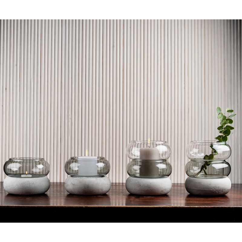 Spodná časť je z betónu a je tak veľmi stabilná, stredný sivý a horný číry diel potom z odolného borosilikátového skla. Váza či lucerna je balená v darčekovej krabici, takže bude pekným darčekom pre milovníkov severského dizajnu.