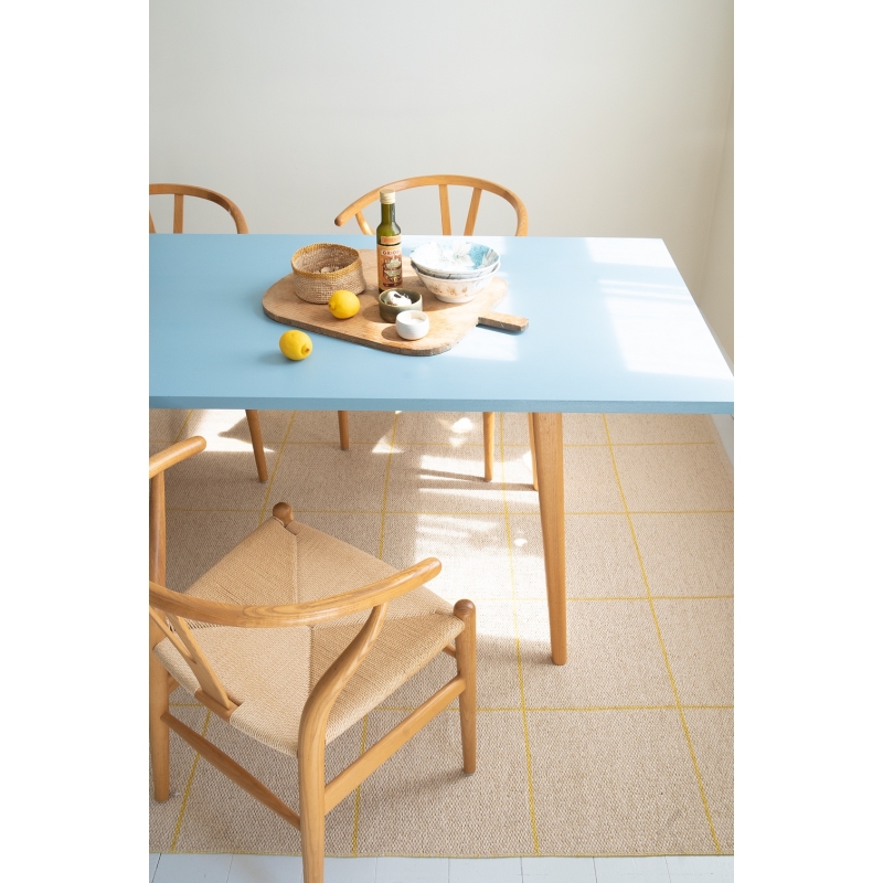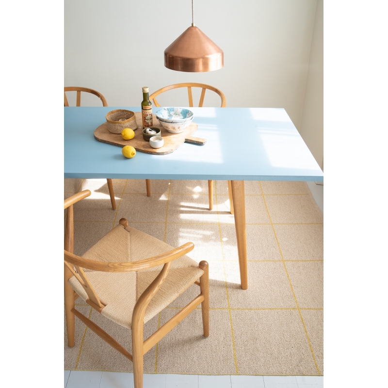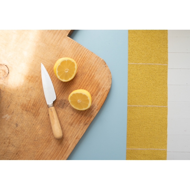 Obojstranný ručne pletený kusový koberec Ruth je z jednej strany výrazne žltý s tenkými béžovými linkami a z druhej v reverzných farbách prevažuje jemný béžový odtieň. Parádny koberec, keď občas chcete úplne zmeniť atmosféru.