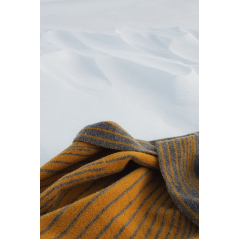 Minagawa tento dojem preniesol na deku pomocou jednoduchých línií, ktoré sa skladajú a prekrývajú ako jemné záhyby látky. Vzniká tak pôsobivý trojrozmerný efekt - nenápadný, ale hlboký. Deku tak vnímate nielen ako funkčný doplnok, ale aj ako poetický obraz v každodennom priestore. Vlnené vlákno tejto deky je farbené rastlinným farbivom získaným z kávy pochádzajúcej z prebytkov z fínskej pražiarne Paulig.