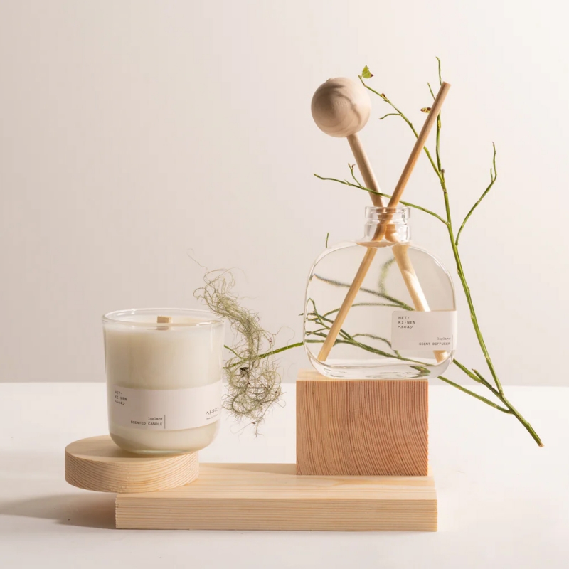 Repkový vosk, sójový vosk, esenciálne oleje z palmovej ruže, mandarínky a borovice lesnej, extrakt z tomkovice lesnej, ostružníka morušky a rododendronu močiarneho, parfum, knôt z osikového dreva pôvodom z Fínska.